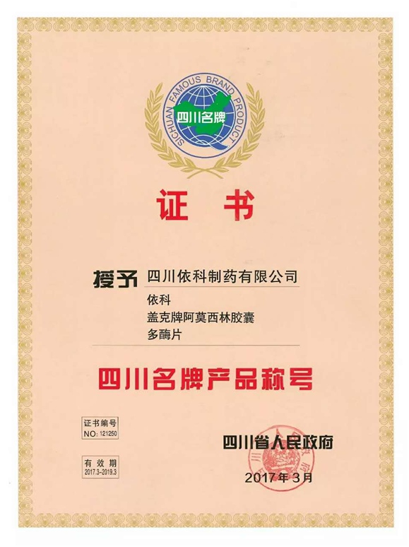 公司高度重视品牌战略,依法注册了“盖克”、“蜀中”、“三星堆”、“阿莫锋”、“益善源”、“蓉通”、“朋友换娶4完整版中文翻译”等108件注册商标,1999年“盖克”、2003年“蜀中”、2007年“三星堆”被认定为德阳市知名商标,2001年“盖克”、2004年“蜀中”被认定为四川省著名商标, 2008年“盖克”商标被国家工商行政管理总局认定为“中国驰名商标”。2017年3月,公司盖克牌、朋友换娶4完整版中文翻译牌阿莫西林胶囊和多酶片被四川省人民政府授予四川名牌产品称号。2016年,公司实现营业收入66373万元,利税7600万元;2017年,公司实现营业收入75045万元,利税7572万元。公司2017年被命名为德阳市第七批院士专家工作站,2016-2018连续三年被德阳市人民政府确定为重点龙头企业。